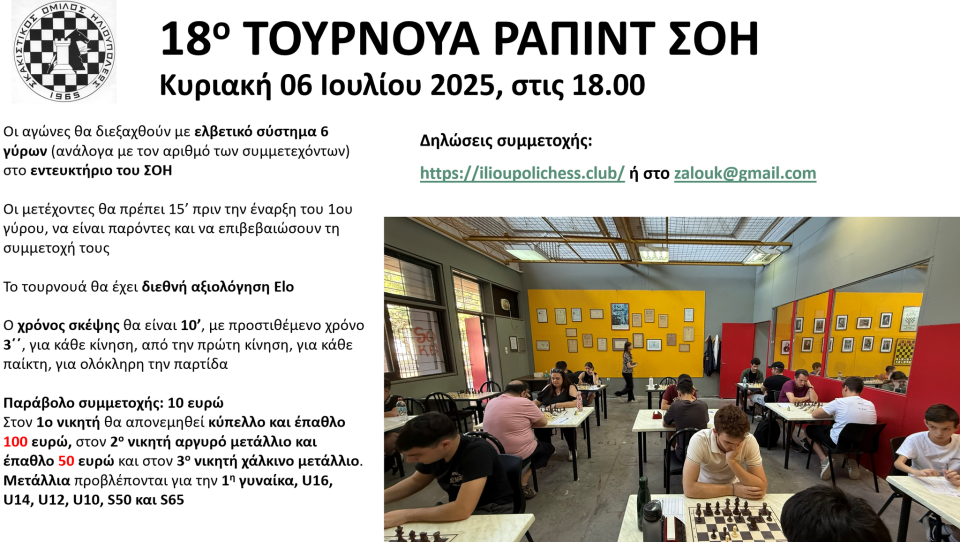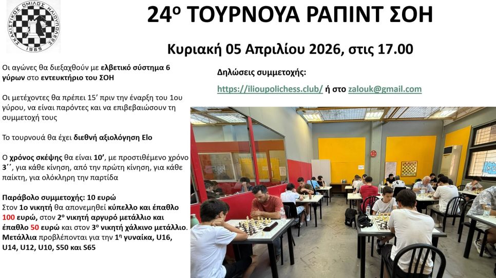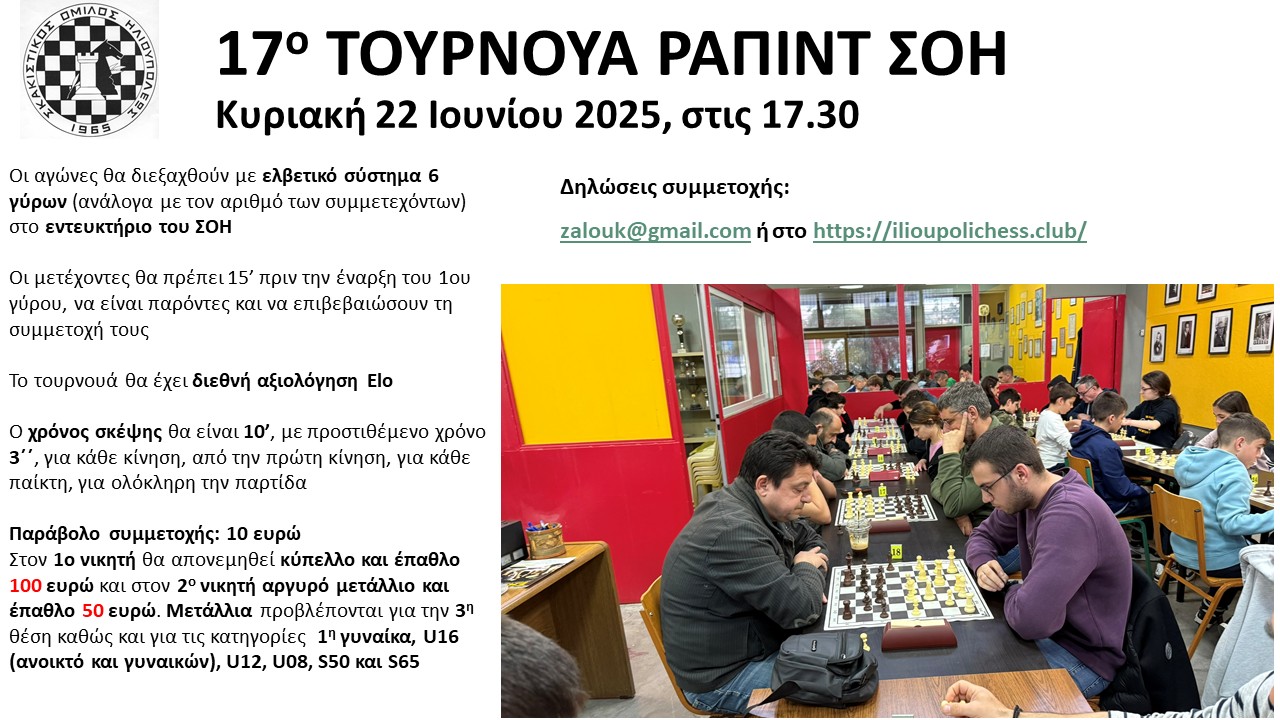 Ο Σκακιστικός Όμιλος Ηλιούπολης, προκηρύσσει τουρνουά Rapid με διεθνή αξιολόγηση, με την ονομασία «15ο Τουρνουά Rapid ”Σπύρος Μπίκος”». Χώρος Διεξαγωγής ΣΚΑΚΙΣΤΙΚΟΣ ΟΜΙΛΟΣ ΗΛΙΟΥΠΟΛΗΣ, Παπαναστασίου 14, Ηλιούπολη (πολύ κοντά στο σταθμό του Μετρό «Άλιμος») Ημερομηνία Διεξαγωγής Κυριακή 2 Μαρτίου, 2025 Ώρα έναρξης 17.30 Ώρα προσέλευσης 17.00-17.30 Σύστημα αγώνων Ελβετικό 6 γύρων, με διεθνή αξιολόγηση Χρόνος Σκέψης (Rapid) 10΄ λεπτά, με 3΄΄ δεύτερα προσαύξηση, από την πρώτη κίνηση. Κριτήρια Άρσης Ισοβαθμίας 1. Το μεταξύ των ισόβαθμων αποτέλεσμα (μόνο αν όλοι οι ισόβαθμοι έχουν παίξει μεταξύ τους) 2. Buchholz System (Cut 1) 3. Buchholz System 4. Sonneborn-Berger score 5. Αριθμός νικών Παράβολο Συμμετοχής 10 ευρώ. Εξαιρούνται οι έφηβοι σκακιστές και σκακίστριες (κάτω των 18) του ΣΟΗ. Έπαθλα 1ος νικητής κύπελλο και 100 ευρώ, 2ος νικητής αργυρό μετάλλιο και 50 ευρώ, 3ος νικητής χάλκινο μετάλλιο, 1η γυναίκα, U16 (ανοικτό και γυναικών), U12, U08, S50 και S65 μετάλλιο Κανονισμοί Αγώνων Θα ισχύσουν οι Κανονισμοί της FIDE και της Ε.Σ.Ο. Διευθυντής αγώνων Λουκάς Ζαχείλας (Email: zalouk@gmail.com, 6937-185747) Επικεφαλής διαιτητές / Yπεύθυνοι κληρώσεων Μάριος Αναστασίου, Μάριος Παπανικολόπουλος Chess-Results