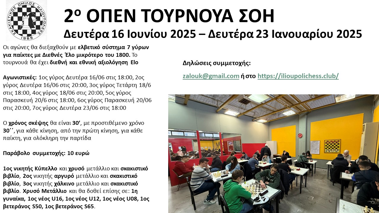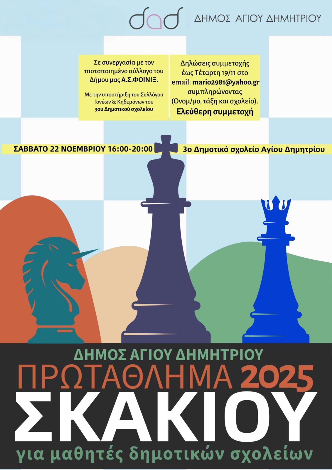 Ο Δήμος Αγίου Δημητρίου προκηρύσσει το Μαθητικό Πρωτάθλημα Σκάκι 2025, με ελεύθερη συμμετοχή για μαθητές Δημοτικών Σχολείων. ΗΜΕΡΟΜΗΝΙΑ: Σάββατο 22 Νοεμβρίου 2025 ΩΡΑ: Προσέλευση και επιβεβαίωση συμμετοχών 15.50-16.15. Έναρξη αγώνων 16.30, αναμενόμενη ώρα λήξης 19.30 περίπου, τελετή λήξης και απονομές επάθλων αμέσως μετά. ΔΗΛΩΣΕΙΣ ΣΥΜΜΕΤΟΧΗΣ: Μέχρι και την Τετάρτη 19/11 στο email mario2981@yahoo.gr (γράψτε ονοματεπώνυμο παιδιού, τάξη και σχολείο). Η συμμετοχή είναι δωρεάν. ΧΩΡΟΣ ΑΓΩΝΩΝ: Το 3ο Δημοτικό Σχολείο, οδός Μητροπέτροβα 3 ΣΥΣΤΗΜΑ ΑΓΩΝΩΝ: Οι μαθητές χωρίζονται ανά τάξη (Α’ έως ΣΤ’) έτσι ώστε ο κάθε μαθητής να αντιμετωπίσει αντιπάλους της ίδιας τάξης. Όλα τα παιδιά θα παίξουν 6 παρτίδες εναντίον διαφορετικών αντιπάλων, σύμφωνα με το εγκεκριμένο από την Ελληνική Σκακιστική Ομοσπονδία πρόγραμμα Swiss-Manager. Κληρώσεις, αποτελέσματα κλπ θα αναρτώνται στο διαδίκτυο, στο Chess-Results.com ΒΡΑΒΕΥΣΕΙΣ, ΕΠΑΘΛΑ: Θα δοθεί Αναμνηστικό Δίπλωμα Συμμετοχής σε όλα τα παιδιά που θα πάρουν μέρος. Για τα σχολεία της πόλης μας ο νικητής κάθε τάξης θα βραβευθεί με Κύπελλο, ενώ Μετάλλια θα δοθούν στον 2ο τον 3ο και το 1ο κορίτσι. Οι διοργανωτές διατηρούν το δικαίωμα να δεχτούν και συμμετοχές παιδιών από σχολεία εκτός Αγ. Δημητρίου, με χωριστές βραβεύσεις (μετάλλιο στον 1ο κάθε τάξης). Την ευθύνη προσέλευσης, παραμονής και αποχώρησης των παιδιών έχουν οι γονείς/κηδεμόνες τους. ΔΙΟΡΓΑΝΩΣΗ: Ο Δήμος Αγ. Δημητρίου έχει αναθέσει το τεχνικό τμήμα της διοργάνωσης στον Α.Σ. «ΦΟΙΝΙΞ» Αγίου Δημητρίου, τον μοναδικό πιστοποιημένο σκακιστικό σύλλογο στην πόλη μας. Με την υποστήριξη του Συλλόγου Γονέων & Κηδεμόνων του 3ου Δημ. Σχολείου. Διευθυντής αγώνων: Νίκος Μενδρινός (διαιτητής και ΕΜ της Ελληνικής Σκακιστικής Ομοσπονδίας, FIDE MASTER της FIDE και της WFCC).