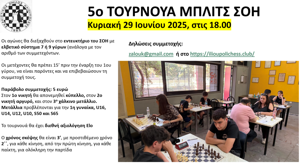Ο ΦΟ Ελληνικού, προκηρύσσει τουρνουά 5 γύρων με διεθνή αξιολόγηση.